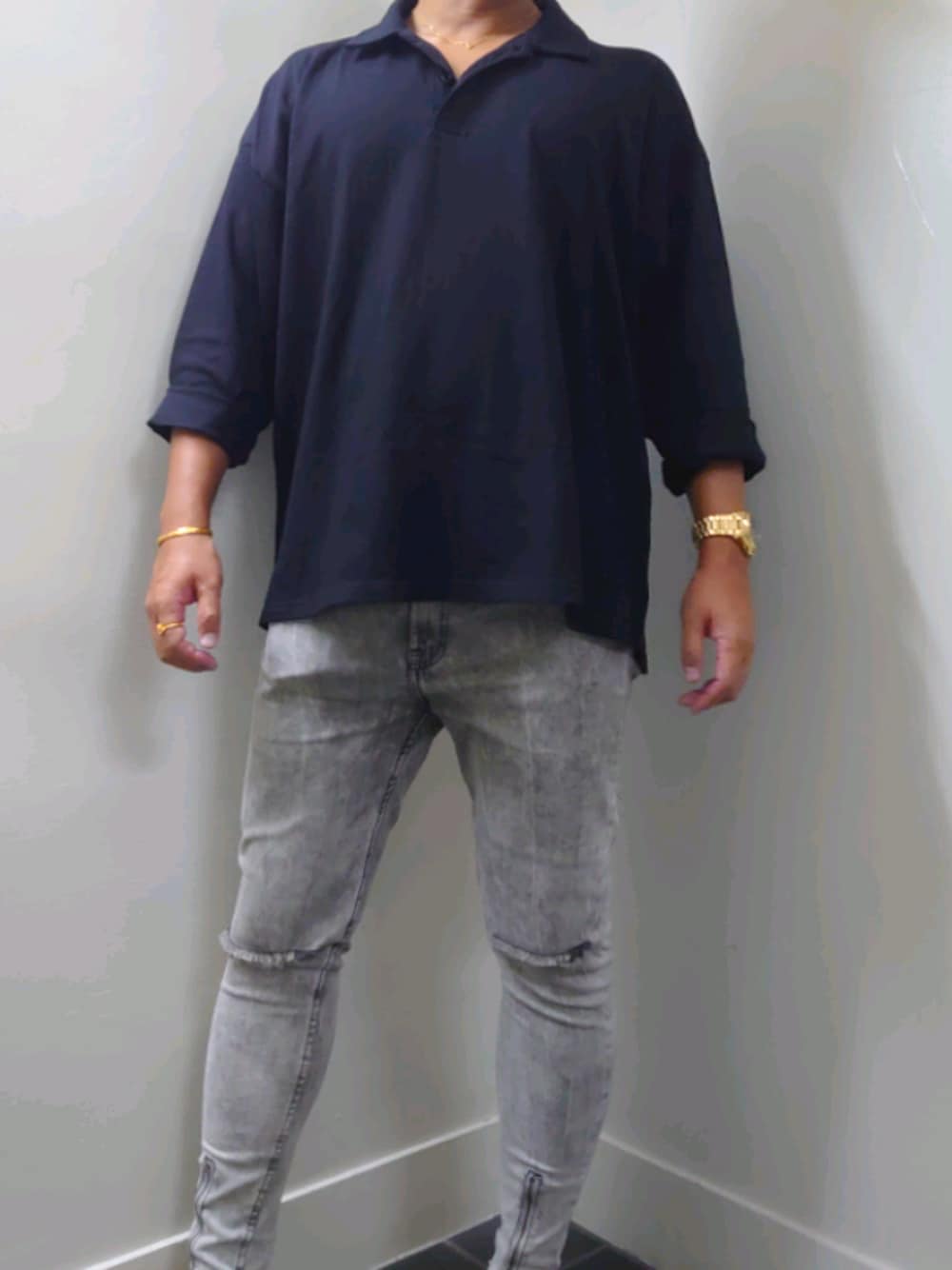 ビッグシルエットのポロシャツ&ダメージジーンズでキレイめなストリートスタイルに仕上げてみました。 暗めな色使いのコーデは、ゴールドのアクセサリーを身につけることでラグジュアリーな雰囲気がグンと高まるのでオススメです🤟😎