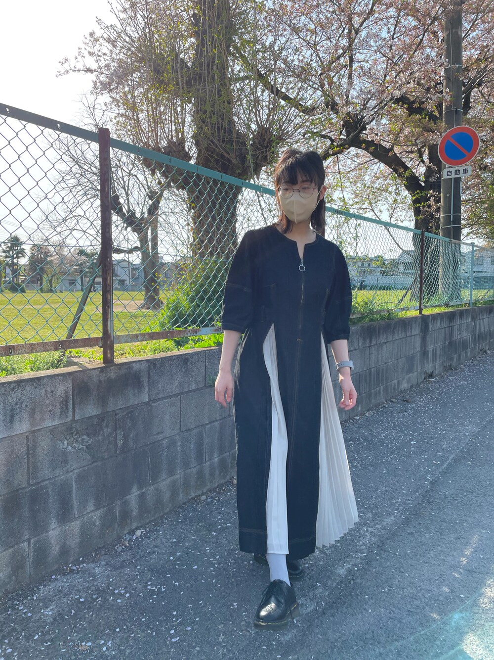 runutskのワンピース「デニムプリーツ5分袖ワンピース」を使ったコーディネート