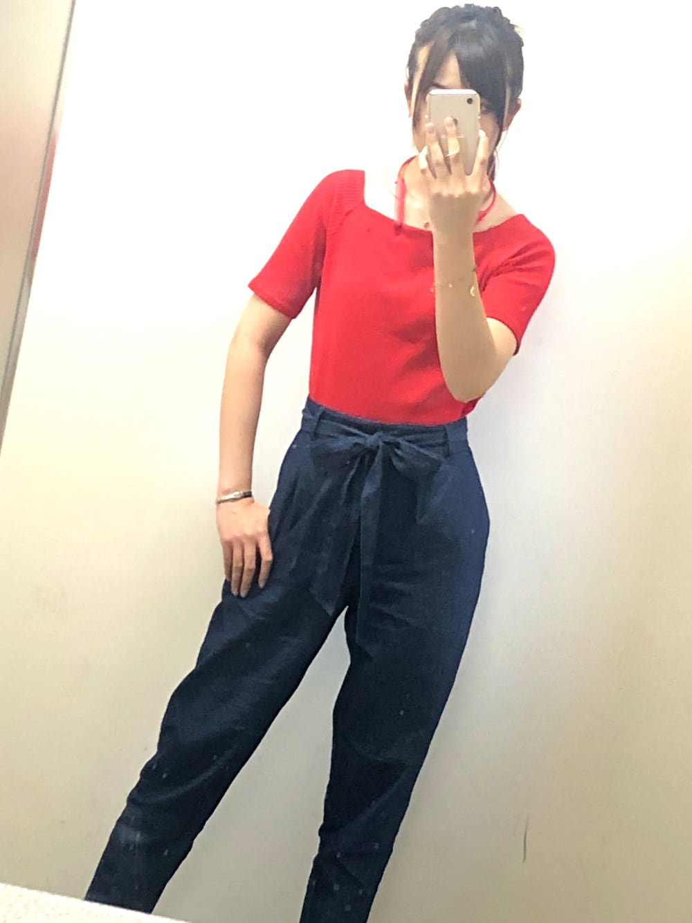 お久しぶりのコーディネート! お気に入りのスクエア襟のトップスと 新しく買ったテーパードパンツ! トップスはピッタリめが好きです♡ ボトムスもリボン締めて女性らしく!