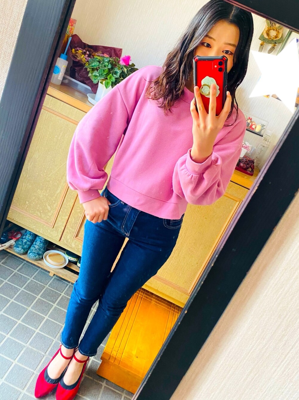 短めトップスが好き!! 久々にパンプス履きました!! 写真よりも少しくすんだピンクのトップスは 形と生地がすごく良いのでお気に入り❤️