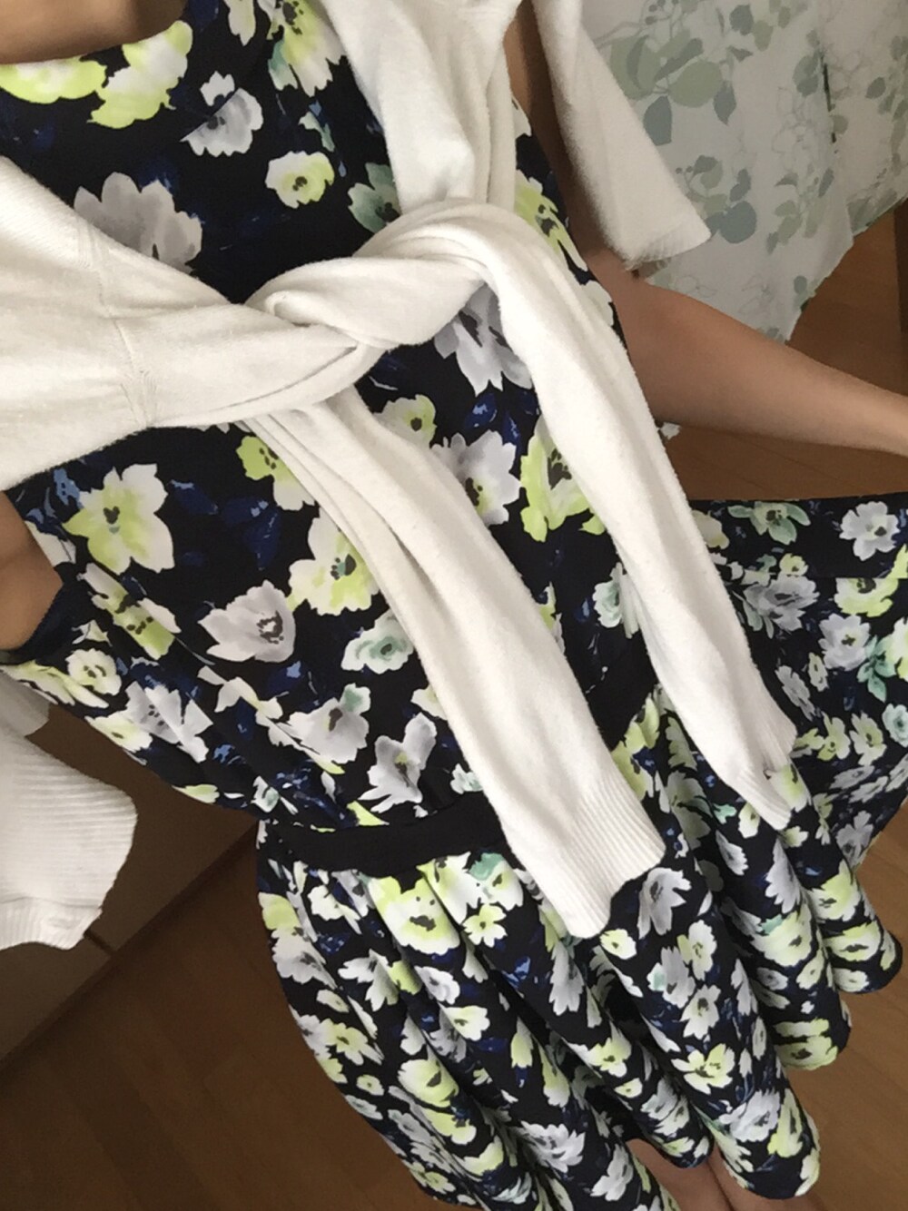 暑いのでノースリーブで涼しい! 花柄なのであまり派手にならないように 白いカーデで抑えました!