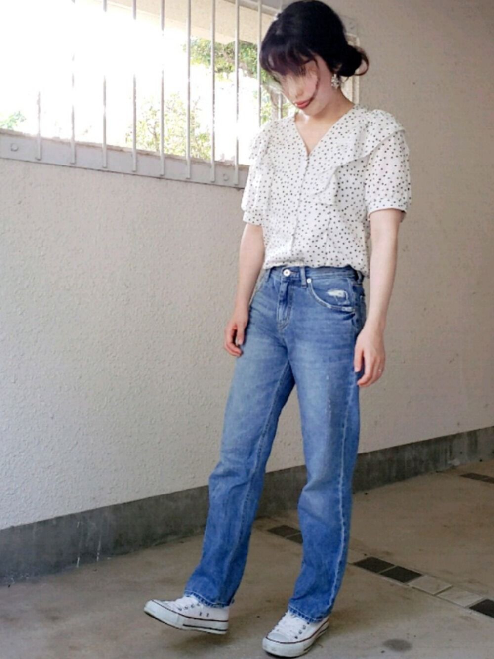 yuriのシャツ/ブラウス「ドット柄パフスリーブフリルブラウス」を使ったコーディネート