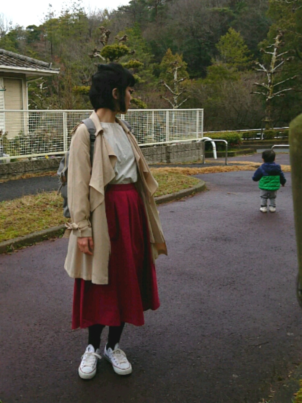 息子とお散歩コーデ✌ ブラウスとスカートは今セールで安くなっててオススメだよ~🙌 トレンチコート→MURUA