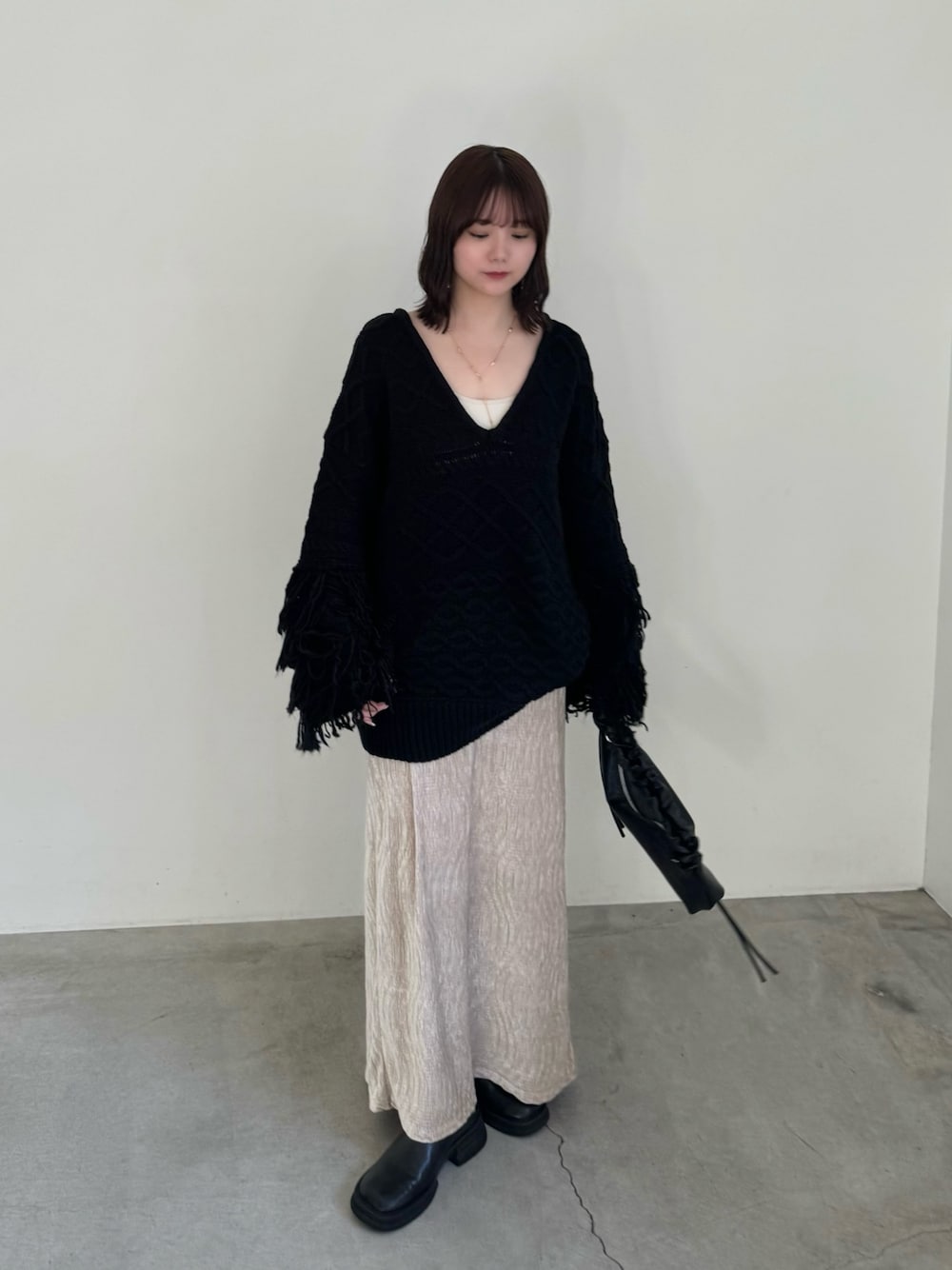 ruri(MOCA office)のニット/セーター「フリンジスリーブオーバーアランニット」を使ったコーディネート