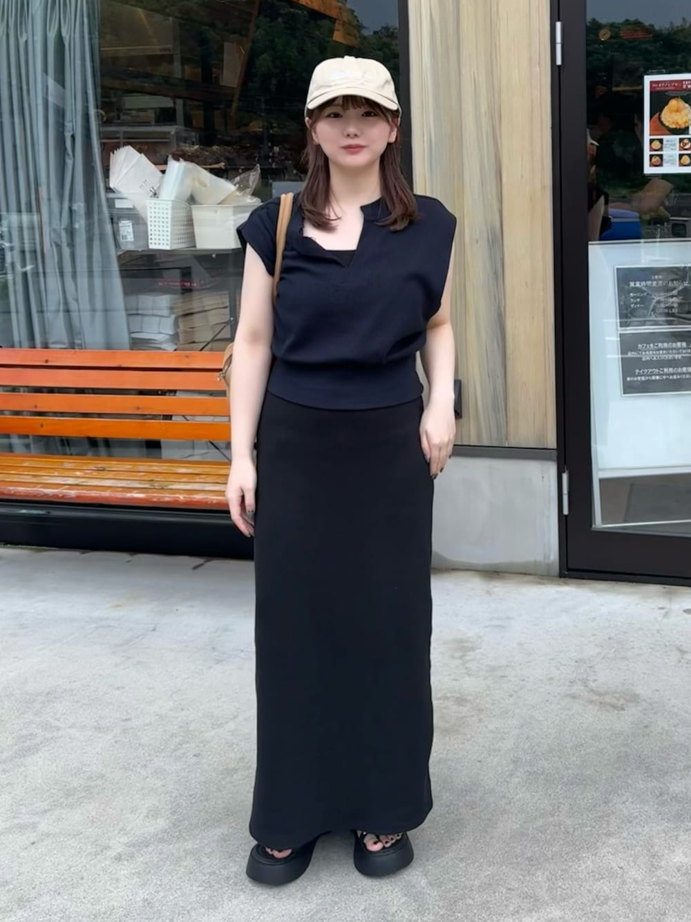 カップ付きで楽ちんなワンピースと二の腕が程よく隠れるフレンチスリーブトップスの夏の王道コーデ♪ 綺麗目になりがちなワンピースをキャップと厚底サンダルでカジュアルに仕上げてみました◎