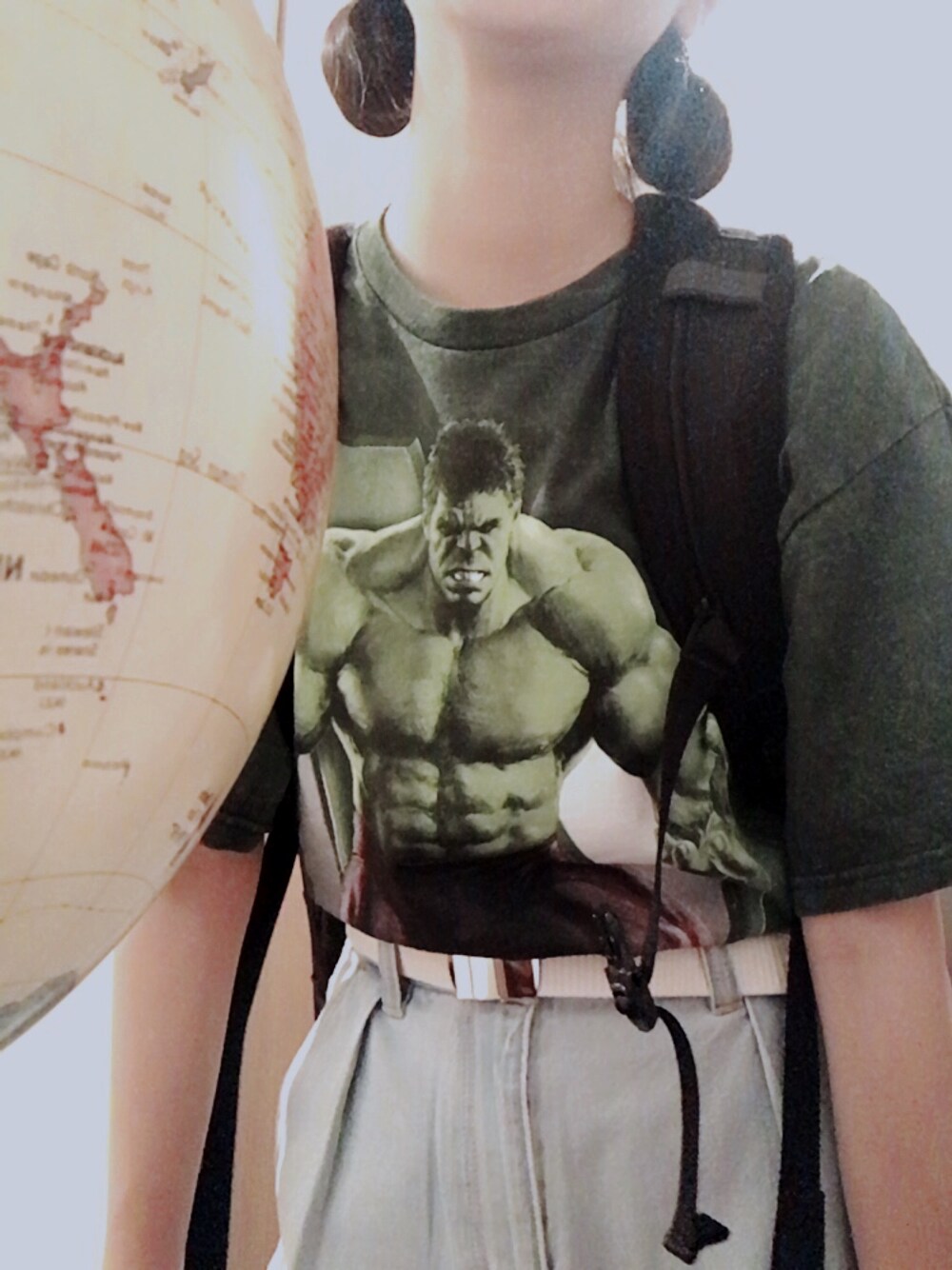 ハルクの可愛い緑Tシャツ安くgetしちゃたよ◎🏳️🌈 ぱぱにゲラゲラ笑われちゃったよね、😤 大きめのTシャツはだしても可愛いけど インしてガチャベルトも可愛いと思う📣💥 足長く見えちゃうよ〜✋🏻