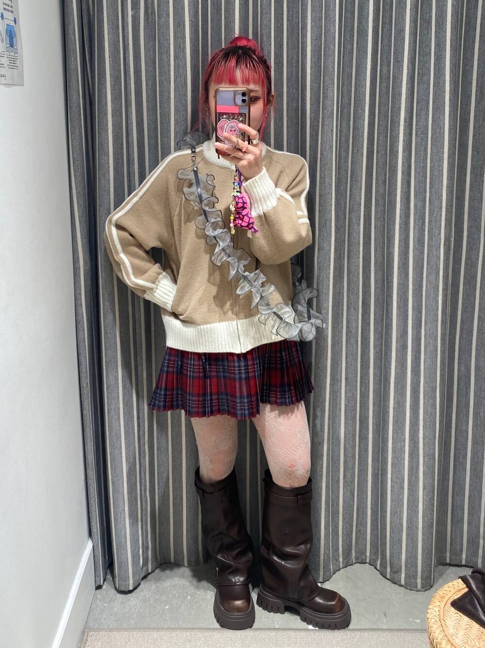 🎀ご覧いただきありがとうございます🎀 ⬇️毎出勤のコーデはこちらから見れます⬇️ instagram @ruta.o.chan ⬆️こちらもフォローよろしくお願いします⬆️ 【トラックジャケット×ミニスカコーデ】 スポーツミックスコーデ♡ スポーツアイテムと甘めのミニチェックスカートの組み合わせはトレンドのブロケットコア! とにかくこのトラックジャケットは、ニット素材なので 王道のナイロン系と比べて一枚であたたかい♡ さらに横幅広めの作りなので脇の締まりが少なめなので、今後ヒートテックとのレイヤードも難なくできそうです🎶 そしてチェックスカート♡ 正直、ワタシにとってはSサイズでも大きめの作りなので 学生ちゃんみたいに1折りしてます♡ 折ってるもののオーバーサイズのアイテムと合わせたら見えないのでオール🆗💘