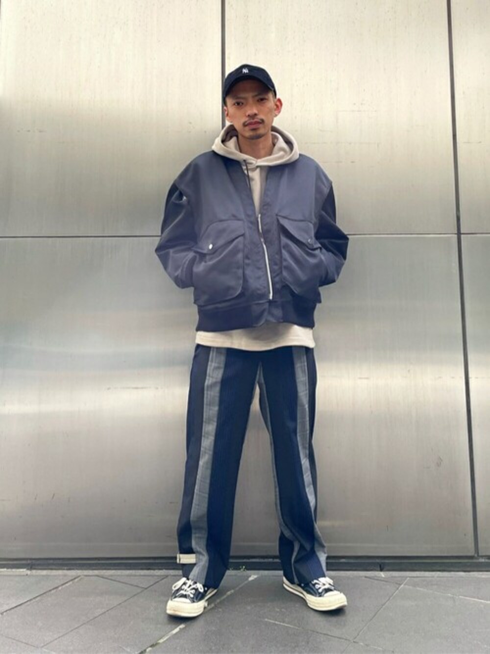 すぐるのブルゾン「トリプルフェイスノーカラーボンバージャケット」を使ったコーディネート