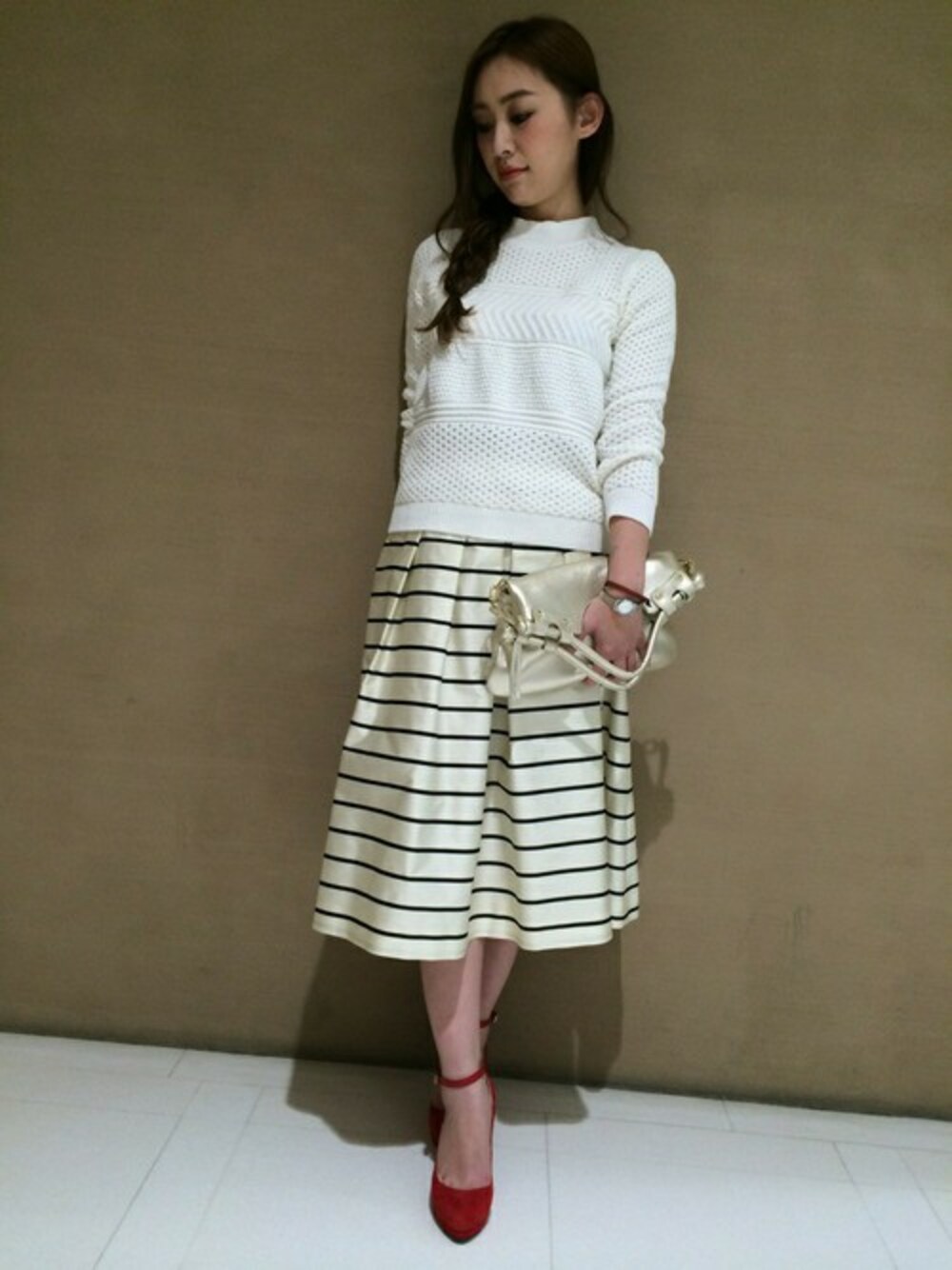 コンパクトな白ニットとボリューミーなスカート合わせが可愛い★ トップス→コンパクト+ボトム→ふんわりがバランス良く見えますーー