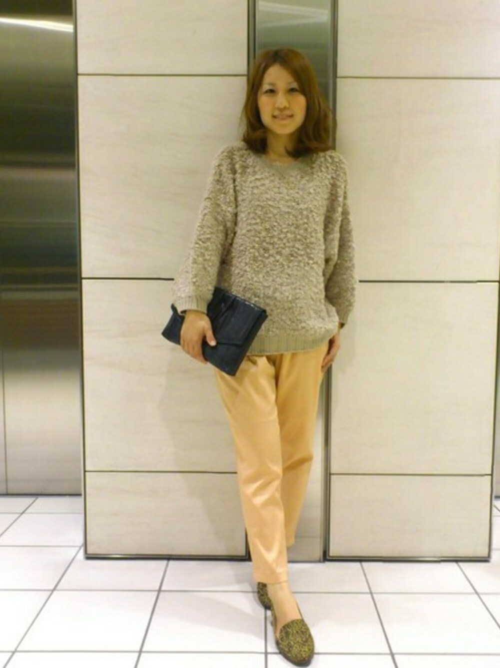 ビッグサイズが今年らしいモコモコニットを、パンツに合わせて大人カジュアルなコーディネートに。