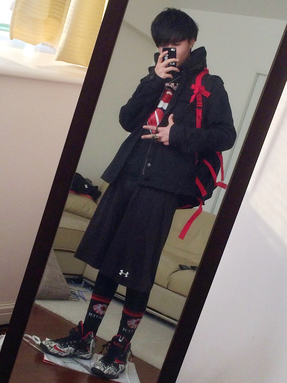 少し寒い気もするけど寒さに負けずに郵便局行ってきます! 赤黒コーデです kiksからcapまで全て赤黒の統一です ぜひぜひフォローしてください( ^ω^ )
