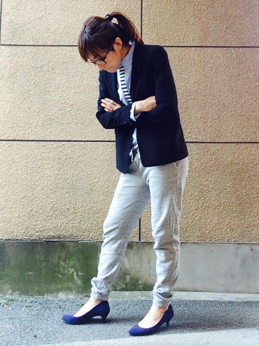 ネクタイチックなデザインのボタンシャツ+ジャケットに、スウェットを合わせてカジュアルしつつも、パンプスでラフになり過ぎない様にしました(^^)