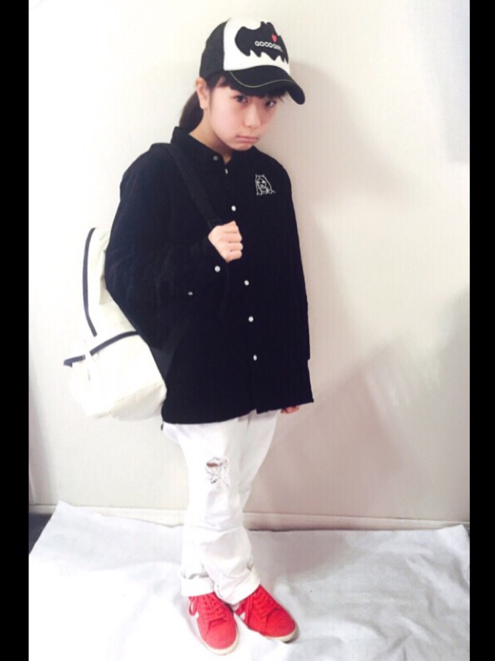 白黒コーデ☆のポイントに赤のスニーカー☆ そして1番のポイントはシャツのポケットからこんにちわ♡ 春か夏にもこのシリーズが出てて、その時に一目惚れしたのですが、買いそびれ😭冬バージョンを見つけて、しかもSALEになってたのでポチっ‥❤️こういうの好きなんです😍ちょっと変なの。笑 しかもコーデュロイで黒に白ボタン、袖口には2つ。かわいい💕ちょっと大き目を購入してダボっと着てます😊 見て頂き、ありがとうございます🎵いいねなどなど、とっても嬉しいです❤️