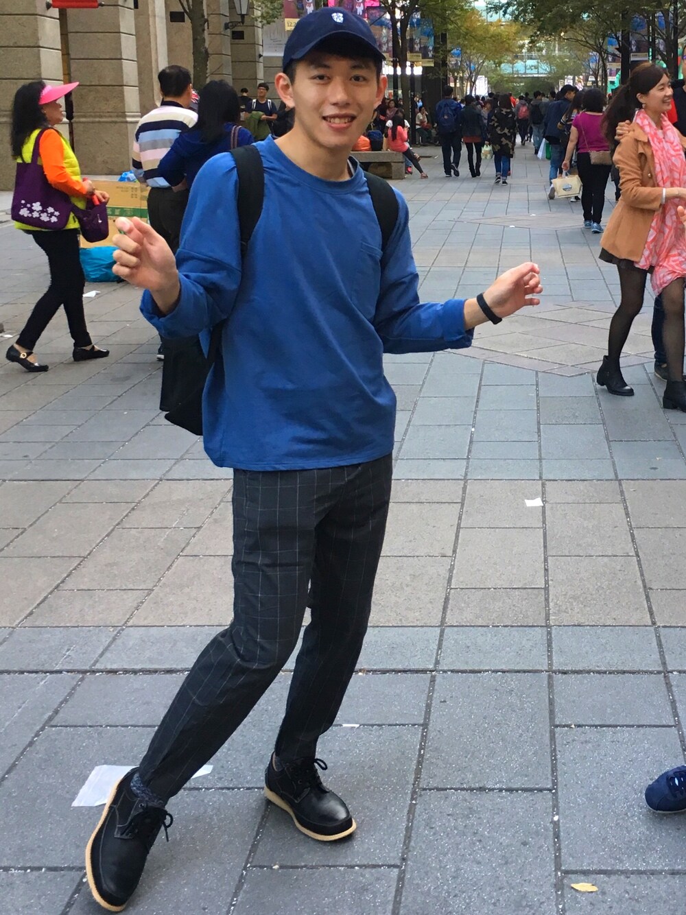 ブラック系のバックパック/リュック、ブルー系のキャップを着用したメンズの冬コーディネートの1枚目の写真