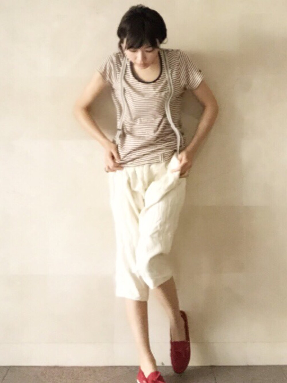 サスペンダー付きボーダーTシャツとゆるパンツがお気に入り。