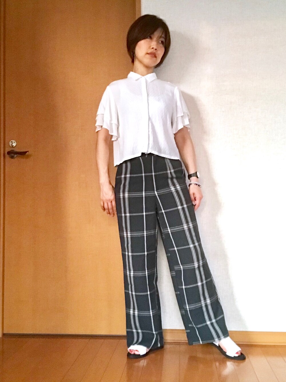 FOREVER21コーデ グリーンとホワイトでシンプル😃 チェックパンツと袖フリルブラウスで何となくトラッド💂🏼♀️ 暑くなるとシンプルになるけど、チェックがあるだけでアクセント😊 柔らか素材で着心地ストレスフリー♪ instagram→ryoko6232 服とネイル💅載せてます。よかったら覗いてみてくださいね😌 いいね👍お気に入り➕フォローありがとうございます😊 みなさんのおかげで楽しいWEAR LIFE♪