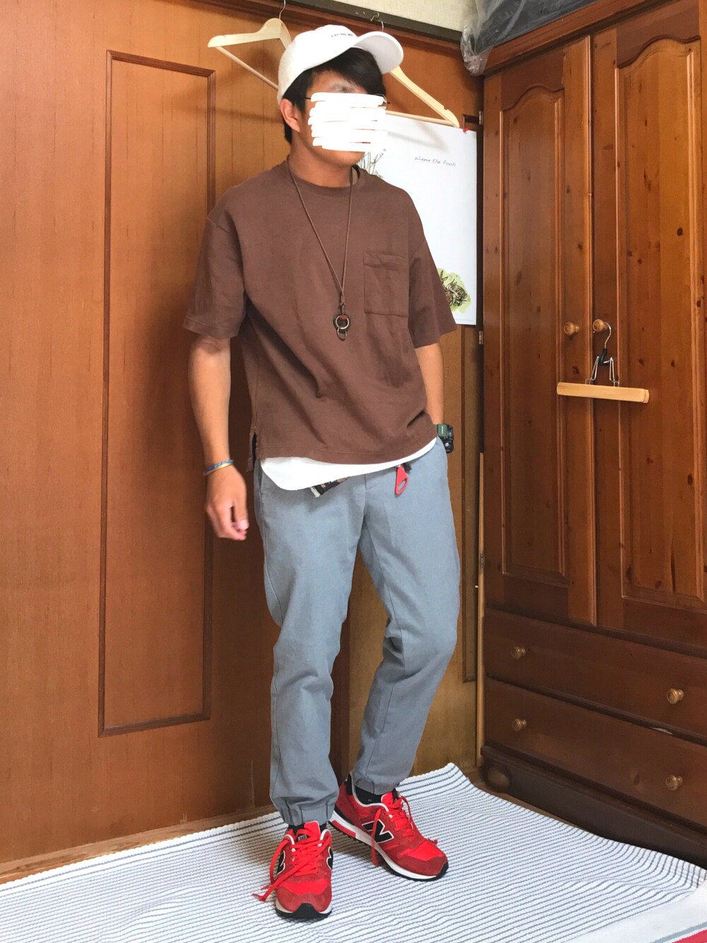 グレー+ブラウンという今までして来なかった色の組み合わせをしてみました。全体的に抑え気味の色なのでスニーカーを赤にしてみました