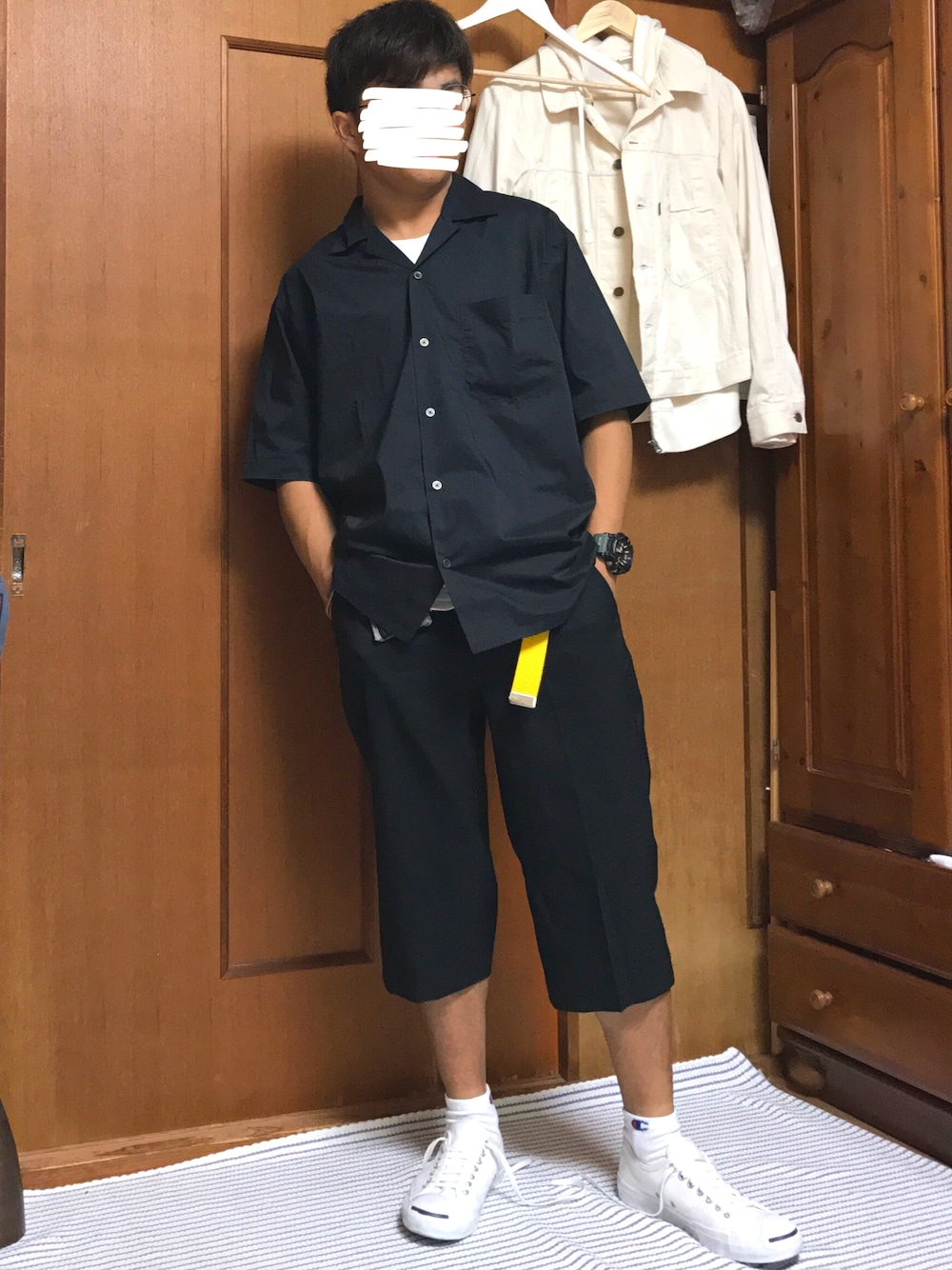 黒基調コーデ。モノトーンとして白を、差し色にイエローを持ってきて見ました。