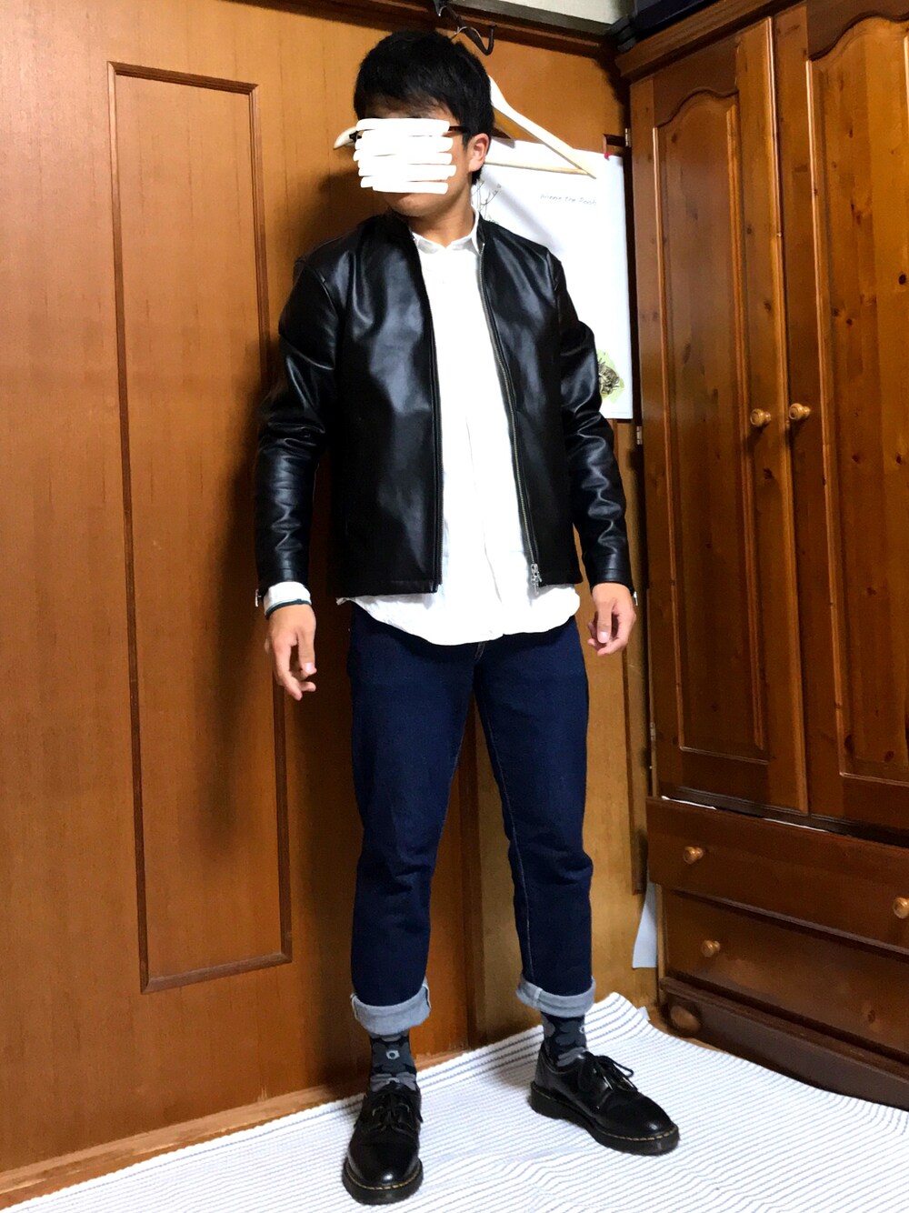 白シャツとデニムの定番にライダースをチョイス