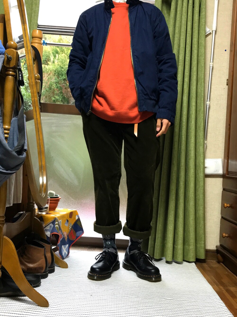 白シャツ挟んでるのがわかりにくい。 古着のコーデュロイの色味が良い。 Tops:M Bottoms:S(?) Socks:40 Shoes:7(UK)