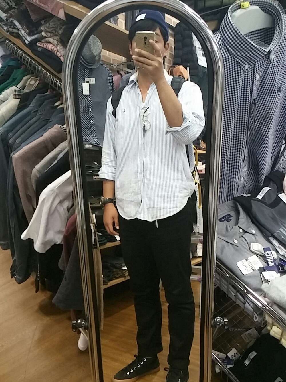 古着はシャツ、スニーカー、バック シャツ:¥3000→「3着で¥2000」by DonDon Down on Wednesday 見にくいですが水色のストライプが入ってます 眼鏡をかけるとどうしても老け顔が助長されてしまいます(;・ω・) 「これはまずいぞ(--;)」と思ってこうしてみました笑