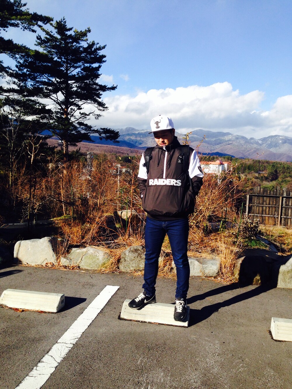 jacket MAJESTIC cap NEW ERA backpack NIXON pants UNIQLO shoes NIKE 草津旅行に来ています。 雪です。手カチカチです。