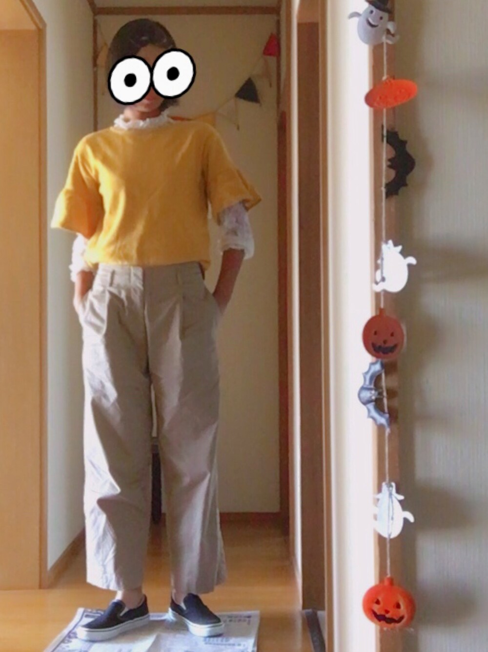 秋色×チノパンツ 今日のコーデのポイントはトップスの下に白のレースを着たところかな…🤔