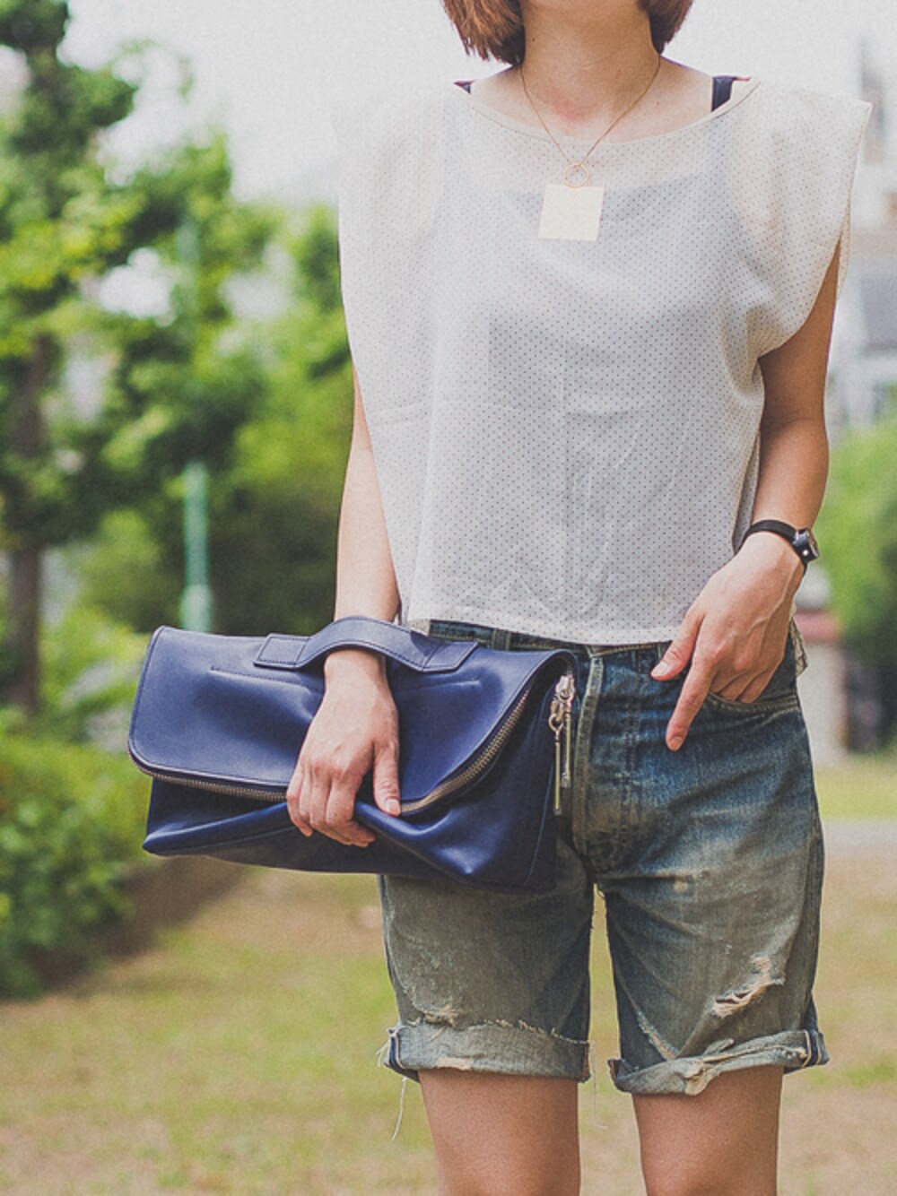 Tops : HANDMADE Denim : EVISU Bag : 3.1 PHILLIP LIM Shoes : PRADA Watch : RIKI WATANABE Socks : UNIQLO Necklace : VINTAGE