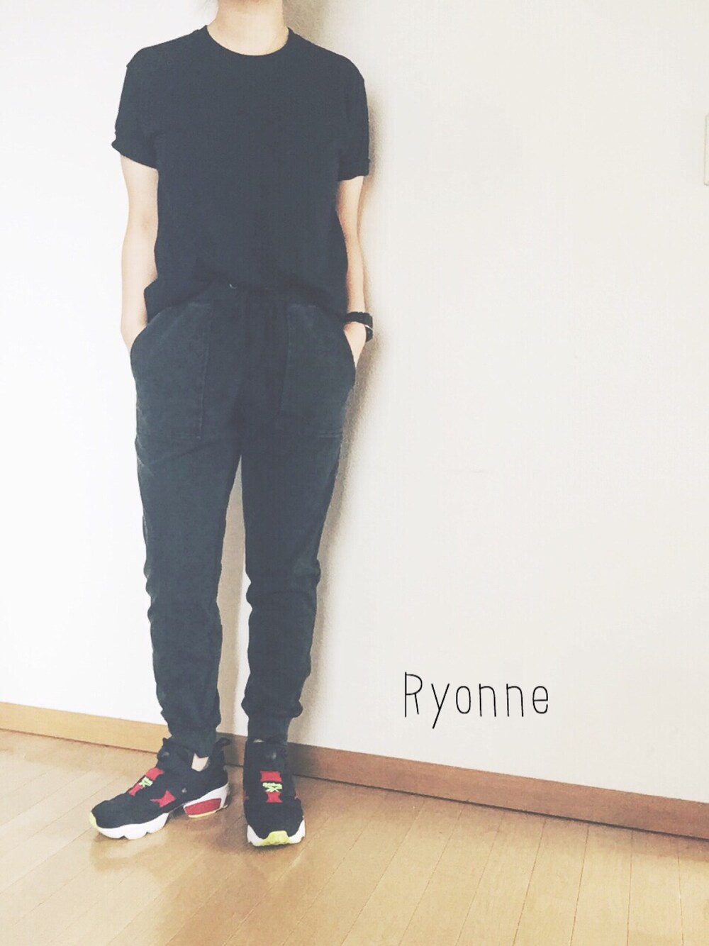 ブラック×ブラック 本日もメンズライクな気分。そしてプチプラ。Tシャツにスエットパンツ…ラクし過ぎ。