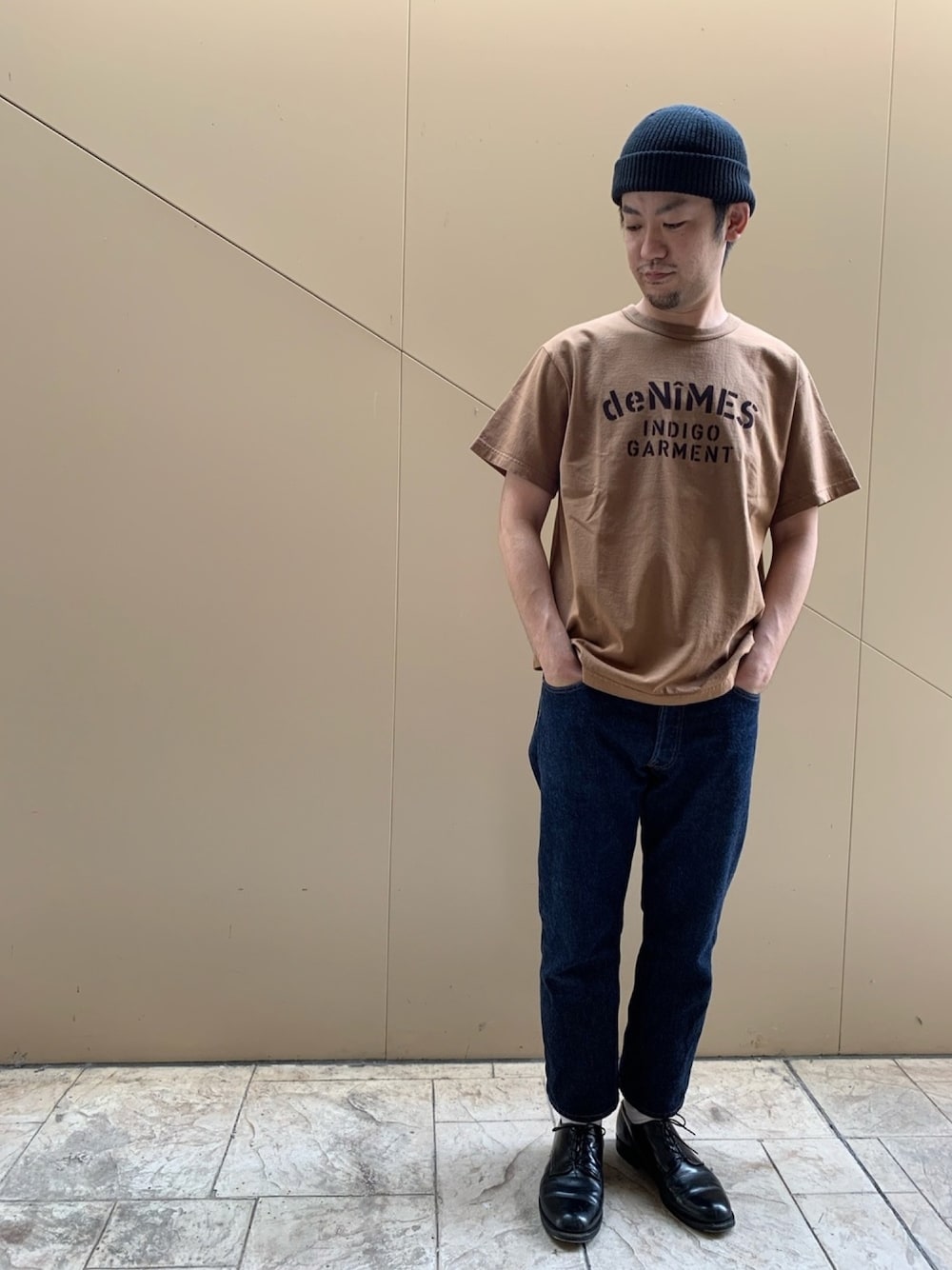またまた半袖コーデになってしまいましたが、少しでも晩夏感を出すためにブラウンのTシャツをチョイスしました♫ フロッキープリントがポイントで、日本製で生地全体も首周りも全然伸び縮みしない、Denimeの名作です!! 66XXはまだまだ濃紺ですが、これからが楽しみです♫ シューズもニットキャップもブラックをチョイスし、シックな雰囲気もプラスしました♫ 67kgの私で、 ・TシャツはLサイズで緩過ぎずタイト過ぎず程良くジャストです。 ・66XXは31インチがジャストですが、敢えて2インチアップで穿いています。 詳細・採寸等はZOZOTOWNをご覧下さい。
