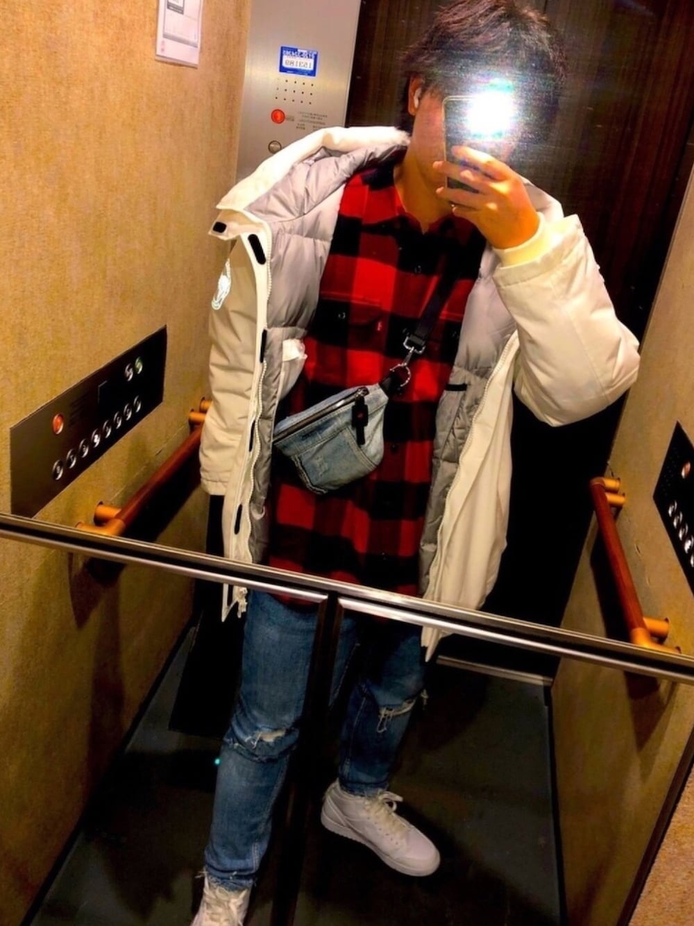 赤のチェックめっちゃかわいい😝😝😝 outer : AVIREX(ダウンジャケット) tops : Levis(シャツ) pants : UNIQLO(デニム) shoes : NIKE Air Jordan1(スニーカー)