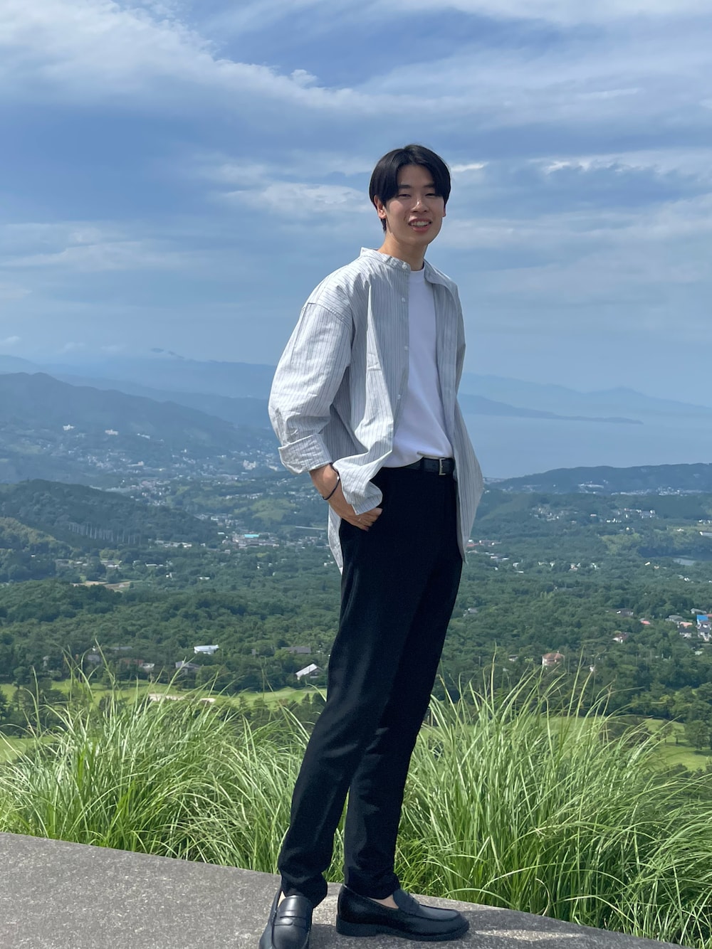 春〜初夏の気温差に対応できるシャツコーデ ・シャツ:袖を捲って少し大人っぽく ・スラックス:タックインで脚長効果 ・ローファー:足元もオシャレに