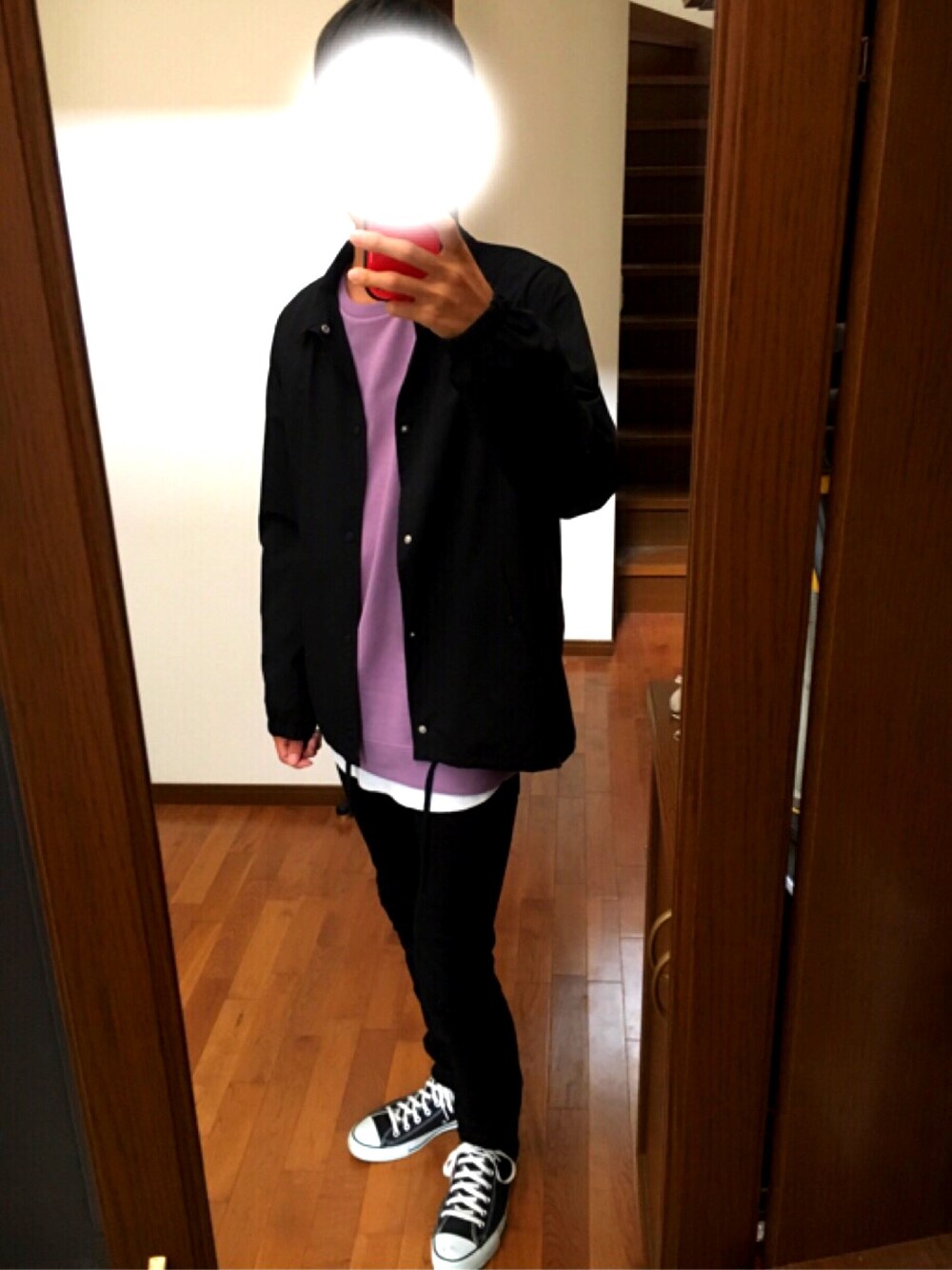 ✨コーチジャケット×パープルスウェット✨ 全体的に黒でおさえた所にパープルのスウェットがいい感じに入って個人的に好きなコーデになりました! RAGEBLUEのスウェットめっちゃお気に入りです!この時期たくさん着ていきたいな〜🌱 <サイズ> コーチジャケット L スウェット M タンクトップ L パンツ 28 スニーカー 27.5 よければいいね、フォローお願いします!🙏🙏