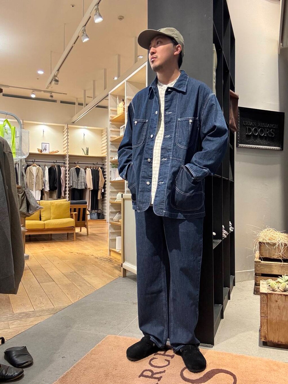 FORK&SPOONの綿麻デニムのセットアップでのスタイリングです。 非常に軽く、サイズ感もゆとりのあるシルエットですので楽に着用出来ます。 デザインはシンプルな為、インナーには無地、柄物どちらも合わせやすい商品です。 ぜひ、参考にしてみて下さい。