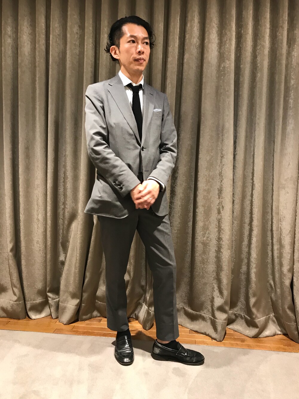 止まない雨はない! 朝からしっかり雨だから、バリっとオールバック気味な遠藤です。 千鳥のアクティブスーツにシンプルな白シャツ ローファースタイル。 ※使いやすいから黒ニットタイは中0日連投(笑) 雨の日に横浜店来店は特典あり!