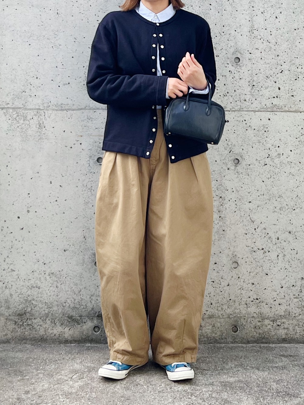 シャツとカーディガンとサーカスパンツでトラッドコーデ