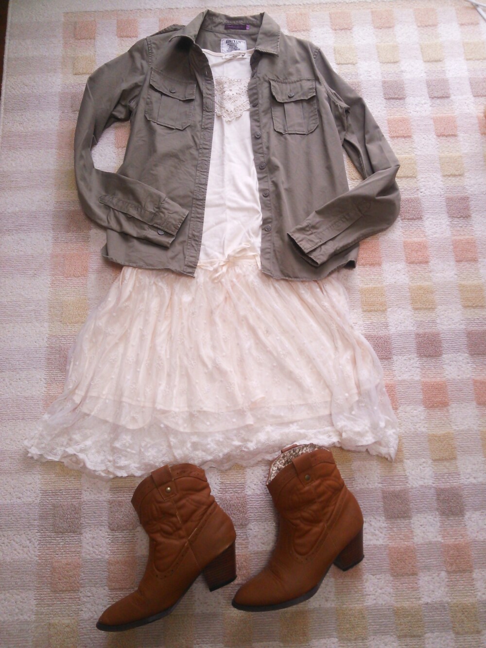 スカート部分がレースのワンピにミリタリーなシャツで甘辛Mix♪