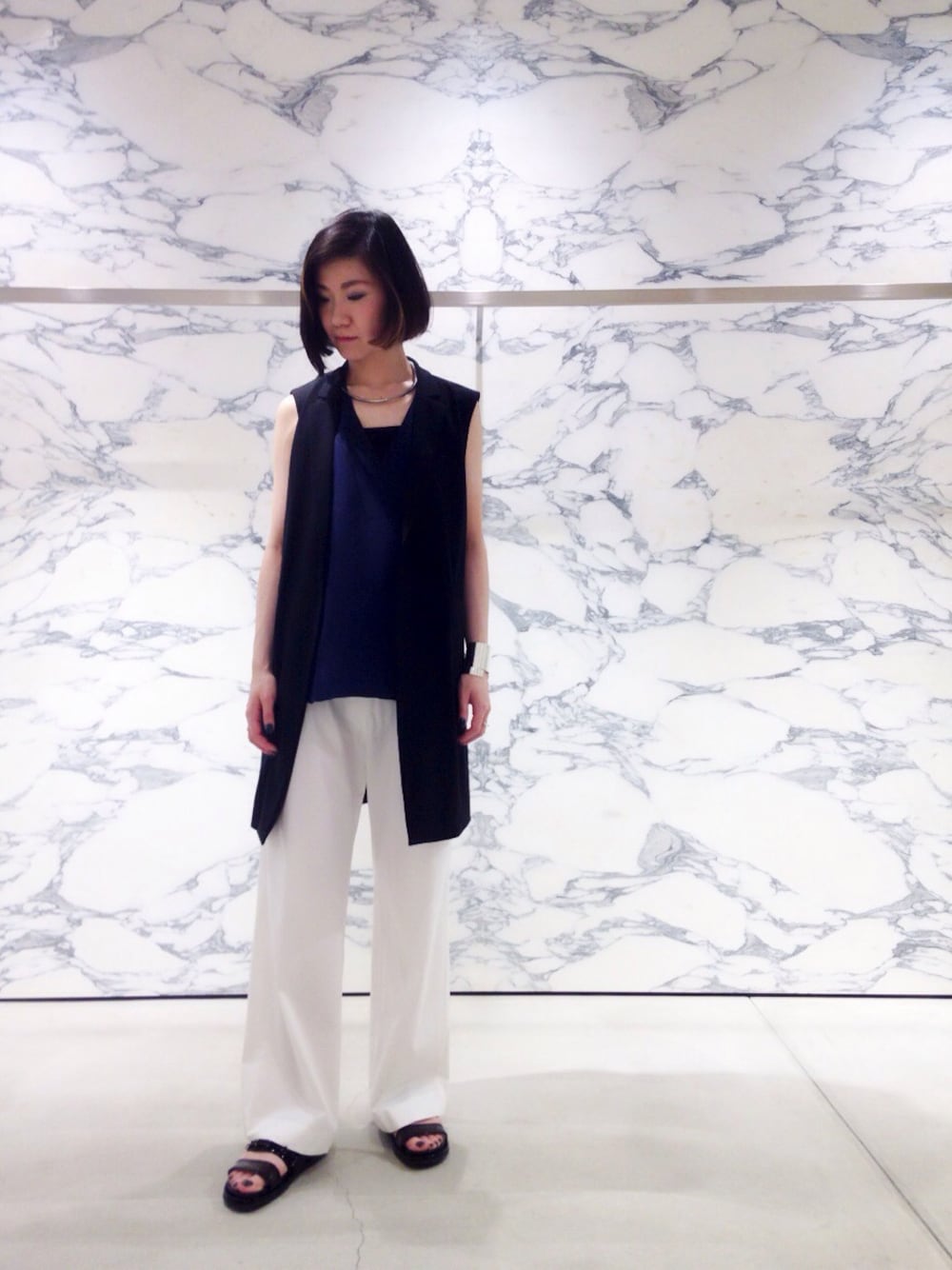 コットン素材のワイドパンツが履きやすく、マニッシュなスタイリングです。シンプルなコーディネートに個性的な形のネックレスがポイント。