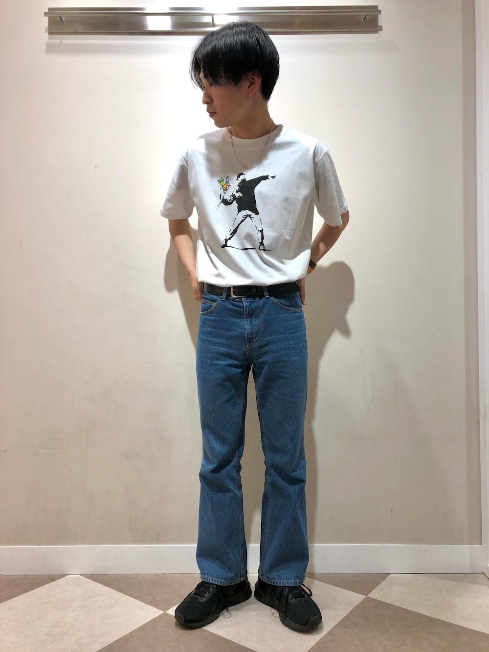 . 昨年に引き続き人気のBANKSYのTシャツを用いたコーディネートです。 サイズ感はジャスト目ですっきりとした 印象になります! プリントが個性的でアクセントになる1着となっております◎ . 商品の詳細はタグからご覧いただけます! 是非ご覧ください💁♂️