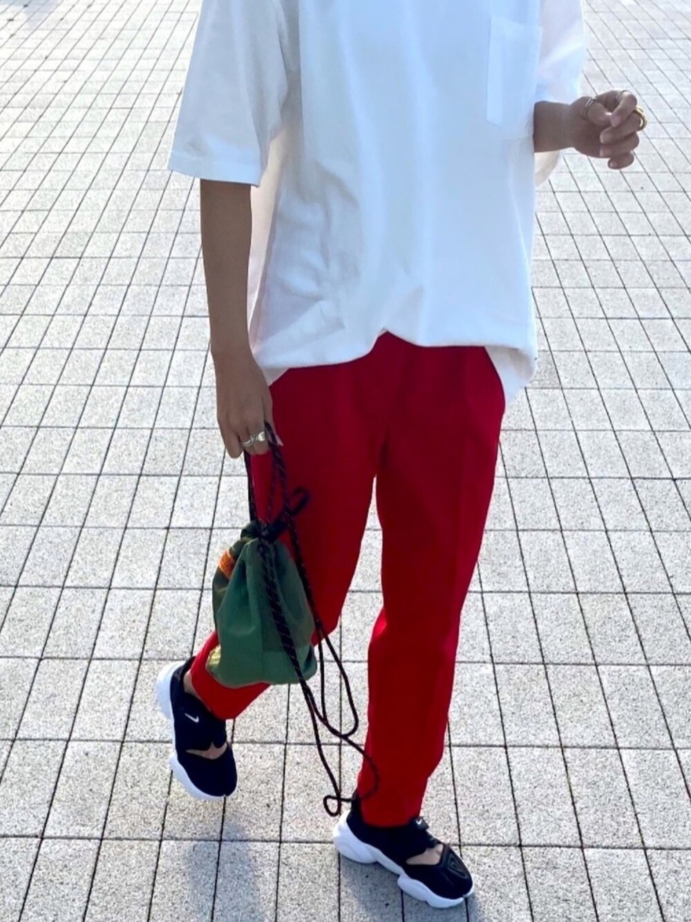 白のポケT×赤パンツ。 ケーブル編みのデザインや裾にブランドネームが 付いてたり。凝ってるとこが♡ インスタもやってます🙋♀️→ryon_1224