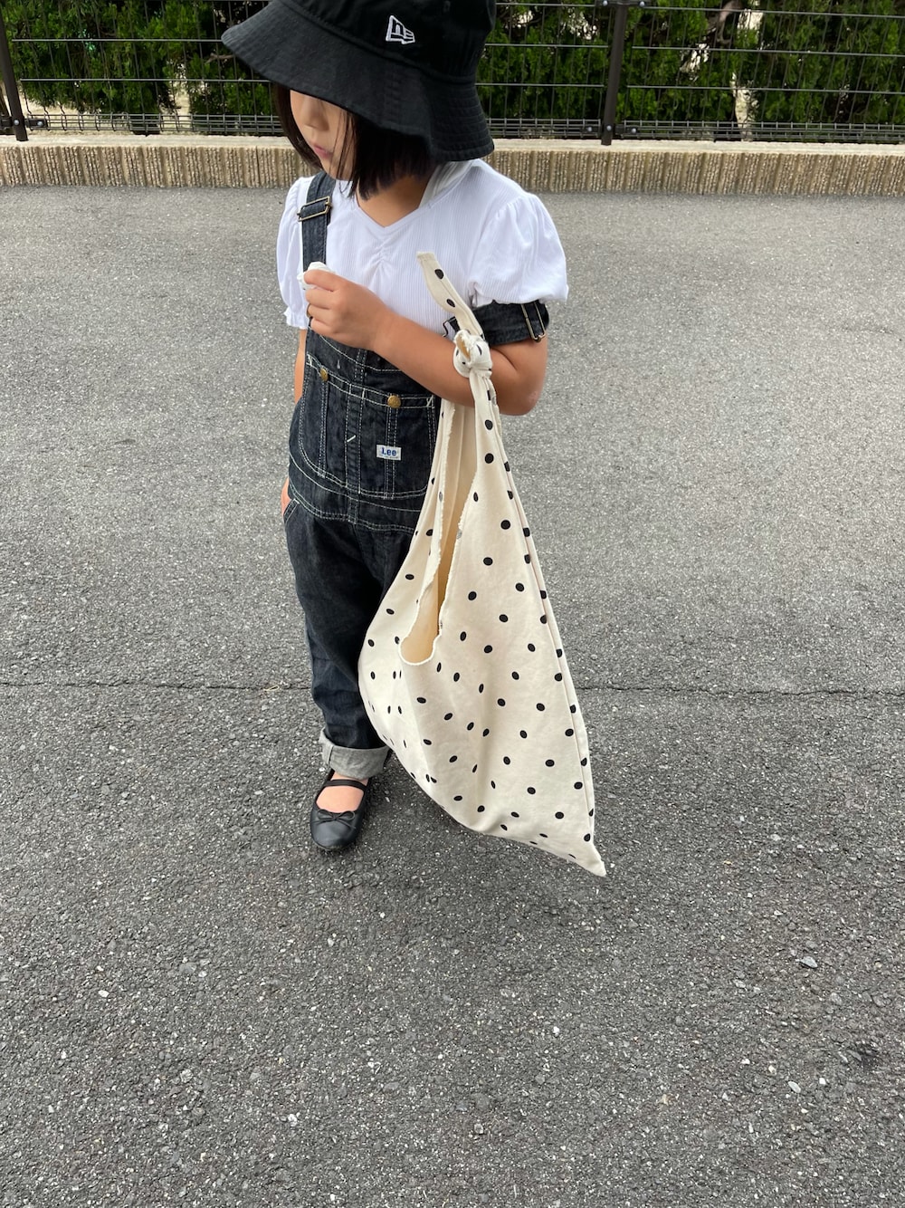 ブラック系のハットを着用したキッズの秋コーディネートの1枚目の写真