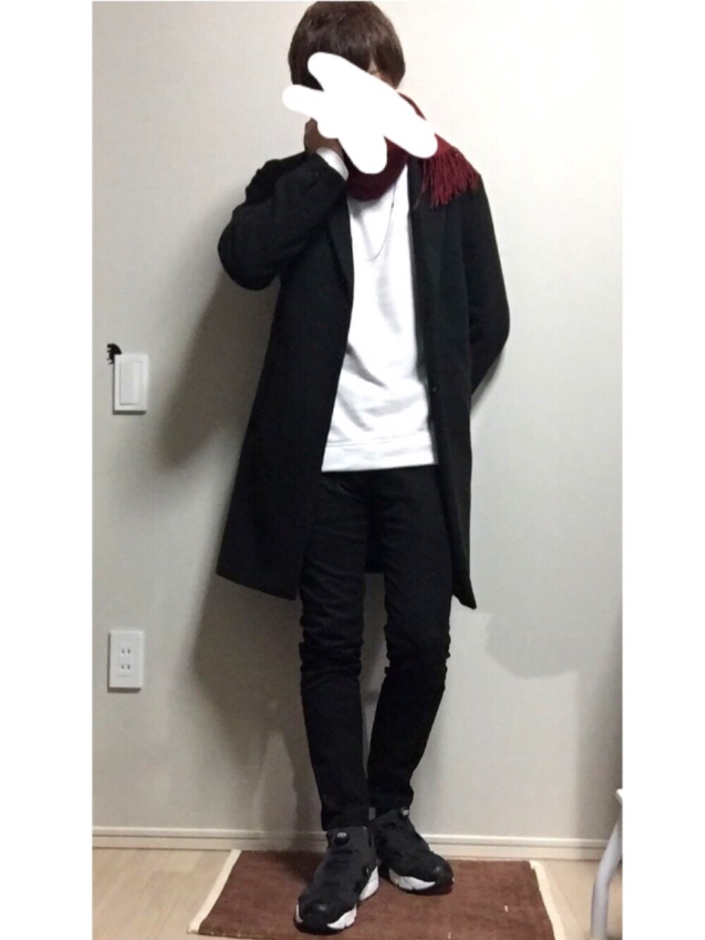 モノトーンコーデ!! 差し色でワインのマフラーだったんですがほぼ見えてません悲しい😩😩