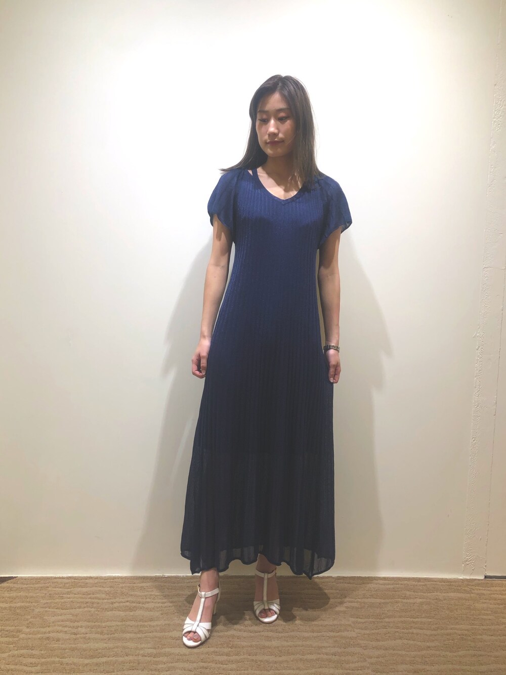 程よいシアー感のあるワンピースに ホワイトのサンダルを合わせることで 夏らしく爽やかな印象に。
