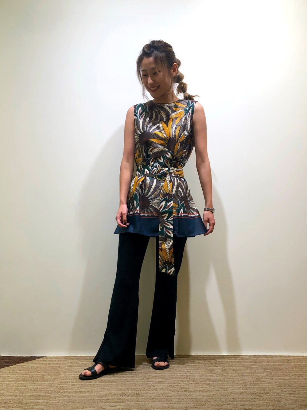 夏らしいリーフ柄トップスにニットパンツを合わせてることで大人っぽくモードな雰囲気に。