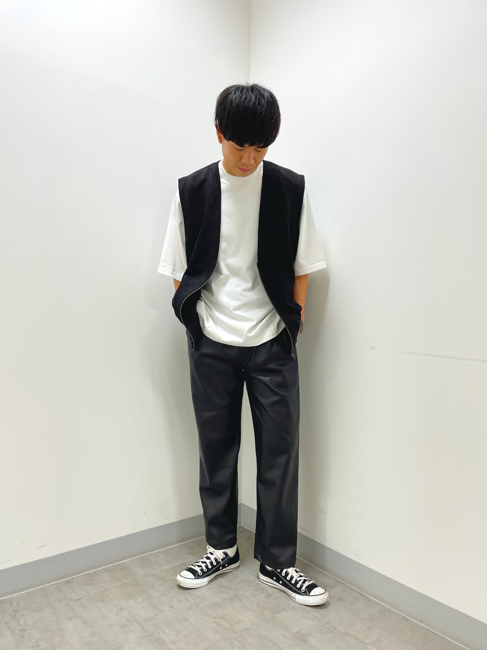 レザーパンツとスエードを使ってコーディネートを組んでみました。スエードのベストはTシャツはもちろん、秋には長袖のシャツとのレイヤードも楽しめておすすめです。