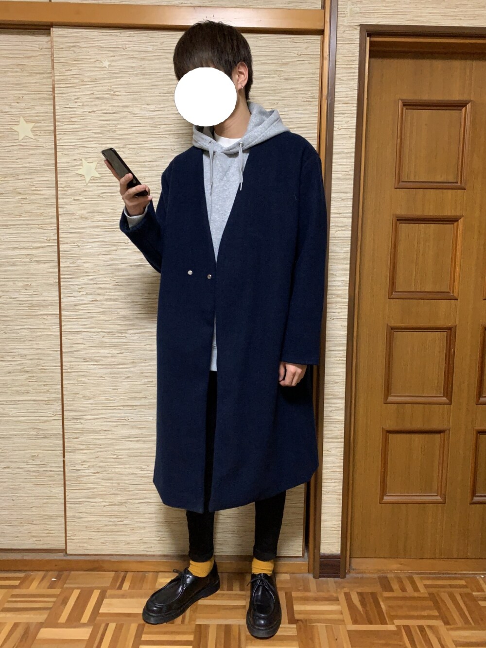 りょーたのノーカラーコート「オーバーサイズビーバーメルトンVネックロングコート」を使ったコーディネート