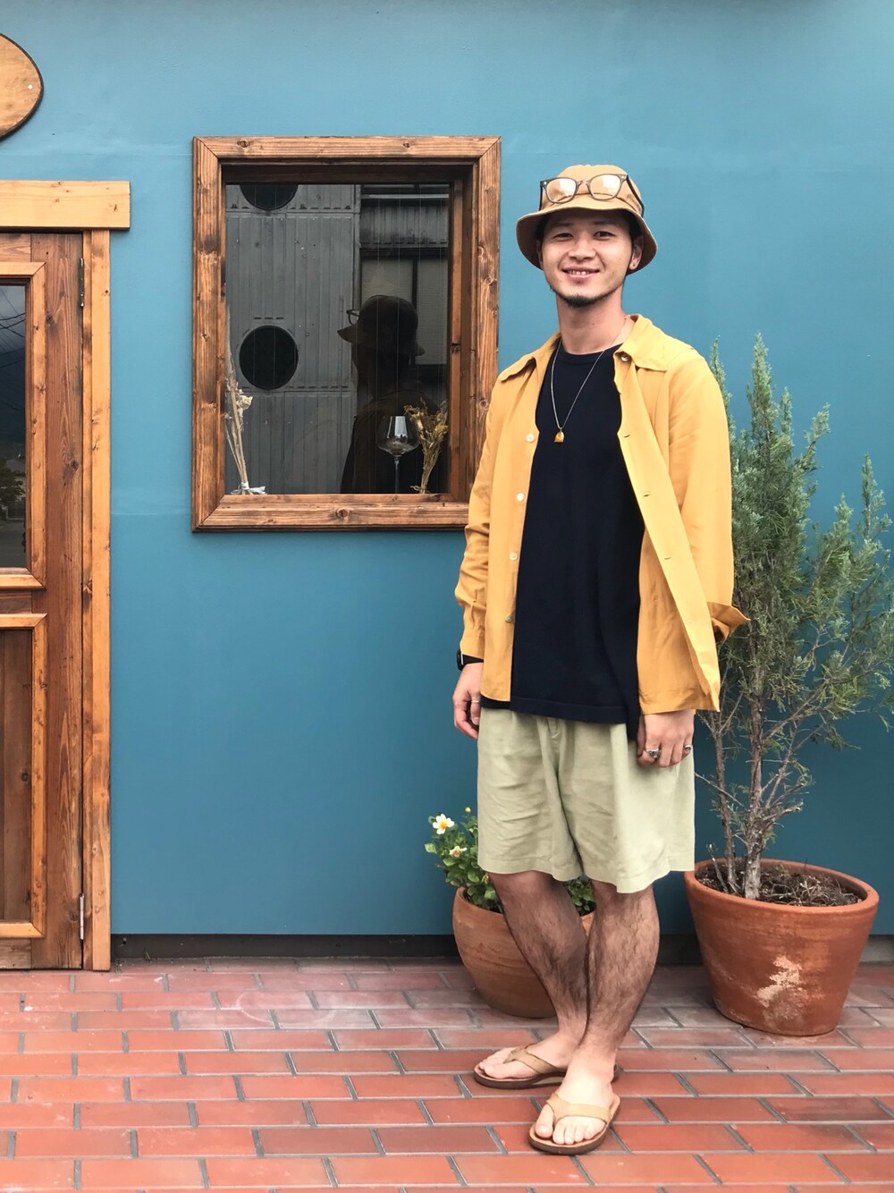 友達がやってるお店の前で。 ベージュや茶ベースのスタイルが最近増えた気がする… 変わった形の40sのギャバジンレーヨンシャツ。極上。なんでも無い格好に1点極上のvintageを入れるとコーデが格上げされる気がします。 大好きなマスタードカラーで。 バケットハットがpierre cardinなんて誰も気がつかないだろう。