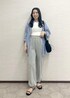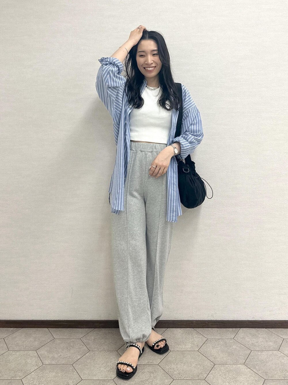 オーバーシャツとスウェットを合わせたカジュアルなリラックススタイル。 シャツとスウェットでメンズライクな印象ですが、 インナーはショート丈のタンクとビジューのサンダルを 合わせて女性らしさもプラスしました!