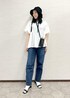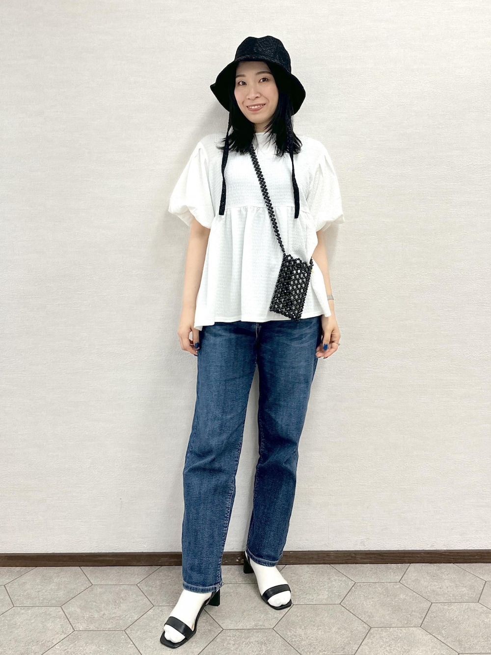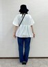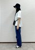 ボリューム袖が可愛いブラウスを使ったおでかけコーデ♩ ブラウスはデザインが可愛いだけじゃなく 二の腕やヒップラインも隠せるので体型カバーになります! パンツは革命デニムでカジュアルな印象に。 帽子はアクセントとUV対策にも◎