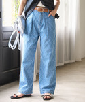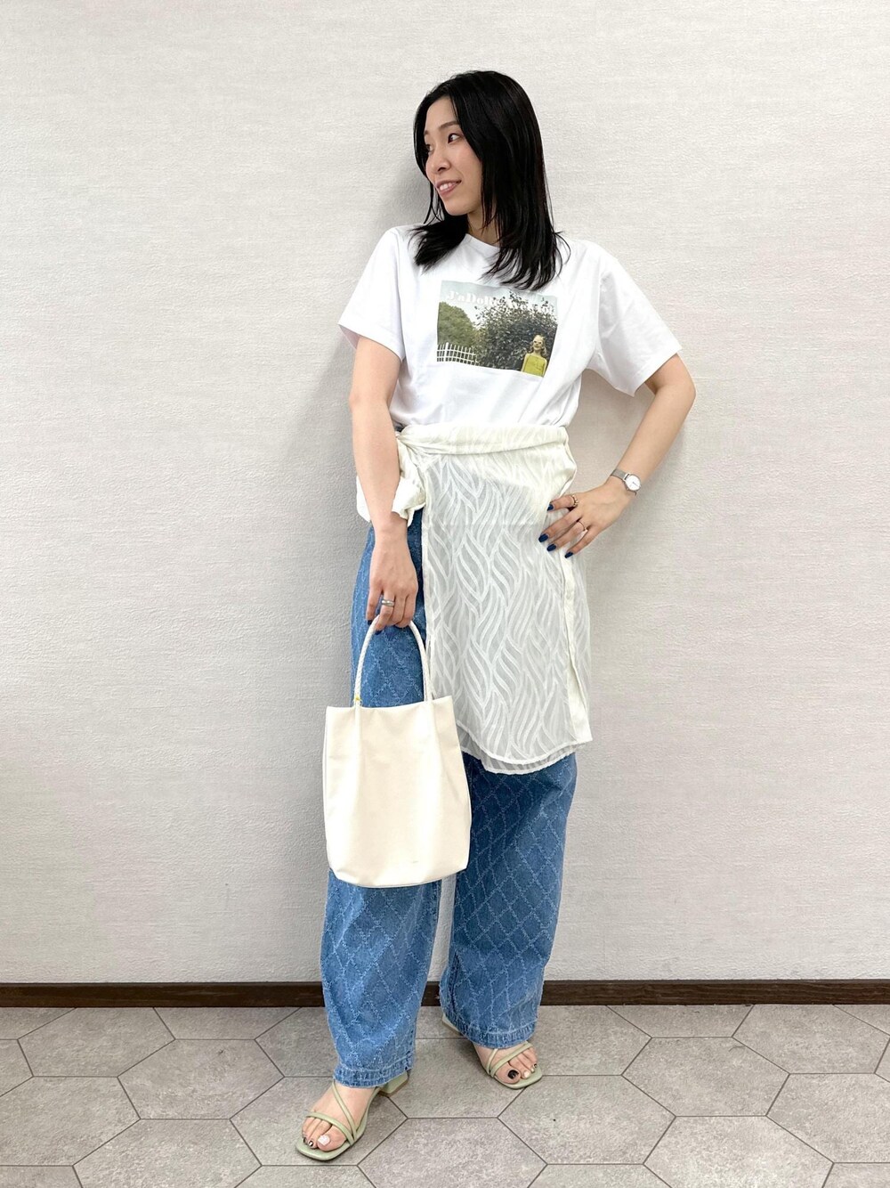 Tシャツ×デニムの王道カジュアルスタイル。 カラーは爽やかに淡い色で統一し、 シンプルになり過ぎないようにプリントTや柄デニムを合わせました。